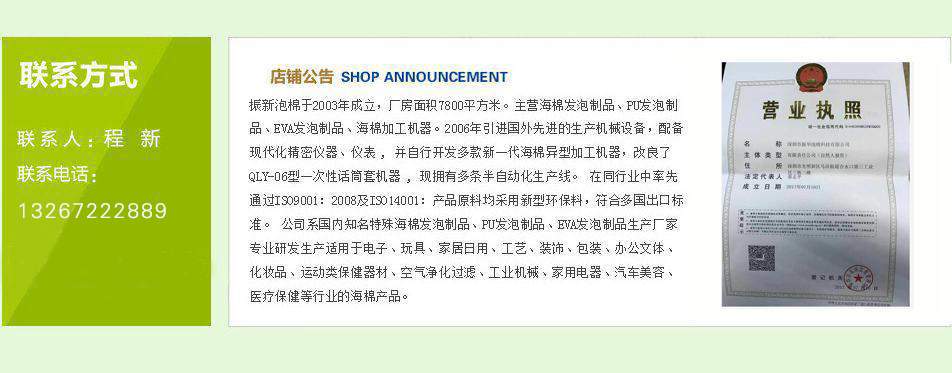 深圳市振新泡棉科技有限公司于2003年成立,廠房面積7800平方米。主營海棉發(fā)泡制品、PU發(fā)泡制品、EVA發(fā)泡制品、海棉加工機器。2006年引進國外先進的生產機械設備,配備現代化精密儀器、儀表 , 并自行開發(fā)多款新一代海棉異型加工機器,改良了QLY-06型一次性話筒套機器 , 現擁有多條半自動化生產線。 我們擁有一批經驗豐富的工程技術人員和高級管理人員,在同行業(yè)中率先通過ISO9001:2008及ISO14001:產品原料均采用新型環(huán)保料,符合多國出口標準。 公司系國內知名特殊海棉發(fā)泡制品、PU發(fā)泡制品、EVA發(fā)泡制品生產廠家,專業(yè)研發(fā)生產適用于電子、玩具、家居日用、工藝、裝飾、包裝、辦公文體、化妝品、運動類保健器材、空氣凈化過濾、工業(yè)機械、家用電器、汽車美容、醫(yī)療保健等行業(yè)的海棉產品。 產品的類型如:高密度聚酯海棉、普通海棉、異型定型海棉、防火/阻燃海棉、高回彈/慢回彈海棉、過濾網狀海棉、EVA玩具禮品、PU發(fā)泡定型玩具禮品等等。產品名稱如:耳機/話筒KTV海棉套、海棉圓球、洗刷海棉、吸水海棉、木漿海棉、化妝海棉、相機海棉、墨盒海棉、壓縮海棉、橡膠海棉、粗細孔過濾海棉、波峰隔音海棉、醫(yī)用海棉、海棉枕頭、包裝防震海棉、1mm厚海棉、電子/醫(yī)用海棉棉簽、EVA球、EVA智力拼圖、EVA鑰匙扣、PU座墊、PU公仔、PU球類等等。 我們還獲得多家國際知名廠商的授權資格,代理多品種家庭用品。 產品多年來一直銷往全球,深受廣大用戶和客商的青睞。